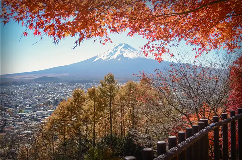 實際上忠靈塔的拍照點那邊看不到太多楓葉一起入鏡,算是有一點小可惜。另外要提醒一個,我不是很確定原因,在秋末到春初的這段期間(因為我是這段期間住這裡的),太陽的角度在中午以後會讓富士山看起來又亮又霧(估計冠雪會是很大的影響,因為有一次山頂增厚了超多雪,整個又白又胖的,超級反光,超難拍),所以要拍到夠清晰的富士山要盡量早點出門。