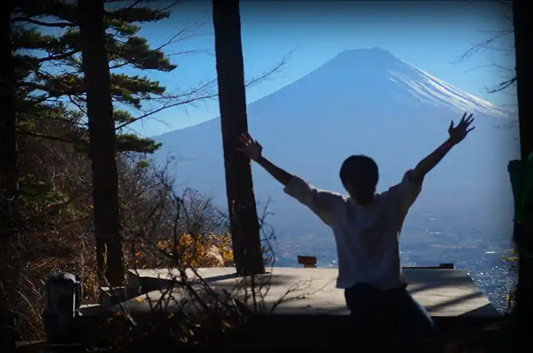 然後有個面向富士山的木平台,可以在這裡邊看富士山邊休息。山頂能看到的景色其實也不算太特別,這邊看跟底下展望台那邊看差不多,但是因為沒有遊客,所以非常安靜,只有遠方高速公路的那種呼呼聲與林間的風聲。
