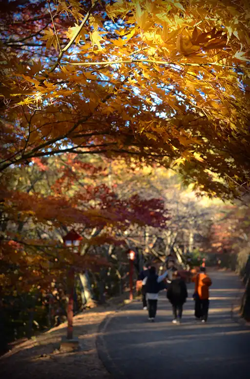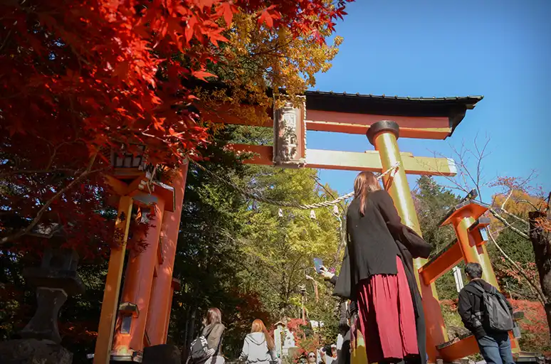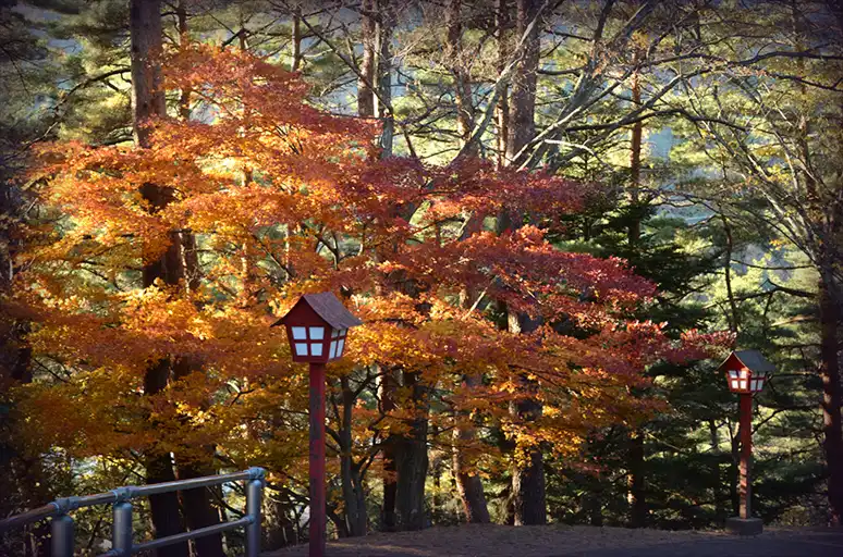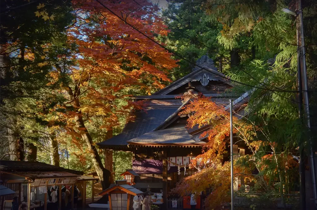 秋天的時候,新倉山淺間神社這邊會呈現這樣楓紅跟常綠的柏樹、杉樹一起交織出一個色彩豐富的景色!
