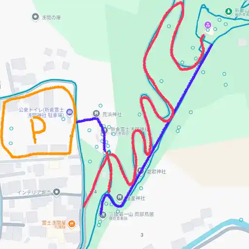 這間淺間神社實際上就只有從鳥居那邊走一點階梯進去而已,忠靈塔在上面。上去公園分兩條路,藍色路線是階梯,紅色是斜坡道。先說結論,兩條都很累!斜坡道實際上坡度也不算低,而且又多走很多路;階梯路就主要是爬升造成你會很喘。對膝蓋與小腿的負擔來說從坡道走下來會比階梯更吃力,但兩條路景色不一樣,所以建議可以坡道上去、階梯下來。