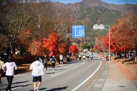 ◀ 美術館的那條路兩旁也都是楓樹,那天剛好碰到河口湖馬拉松,居民都超熱情的,很多人都是全家大小在路邊看比賽幫選手加油,參與度高的很感人。