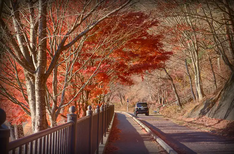 河口湖周邊最有人氣、交通又最方便的楓葉景點,就是今天的主角河口湖楓葉迴廊。河口湖大橋下來後,南北岸都有各自的一條觀光商業街,北岸的楓葉迴廊剛好在中間的位置,前面從河口湖美術館開始有連續三間蓋在湖邊的美術館,後面(逆時針方向)則是往有波波草以及有洋房造型精緻商店區的大石公園。由於北岸才能看得到湖與山相映的景色,所以也是許多主打美景的高級飯店、民宿、露營場的所在地。