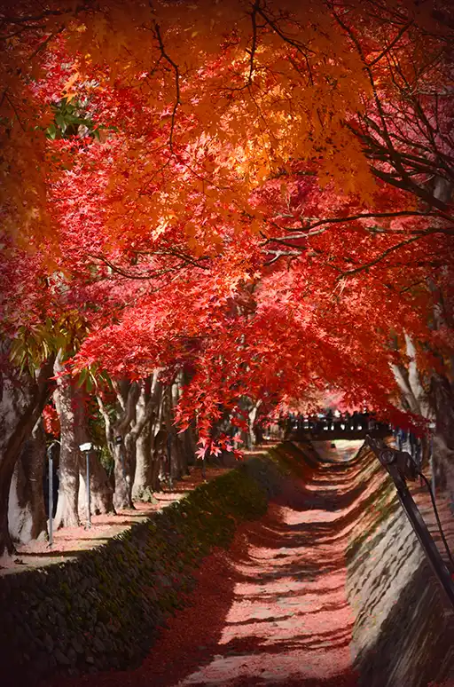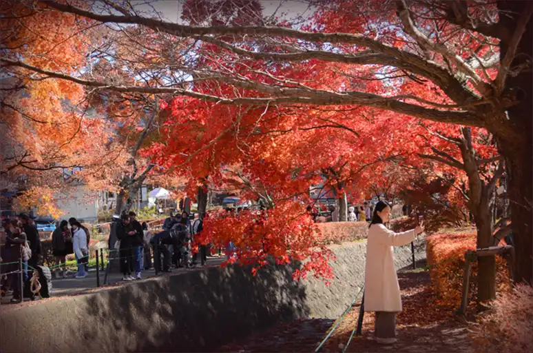 網路上有些照片可以看到下面的水溝也鋪滿了楓葉,整個都紅通通的,但實際上要看到那個景象應該不容易,我去的時候水溝裡的落葉大概也就覆蓋個40%,要能看到連水溝都紅的可能得要抓一個楓葉開始掉一大堆,又還沒顏色轉黑掉光的時間點。
