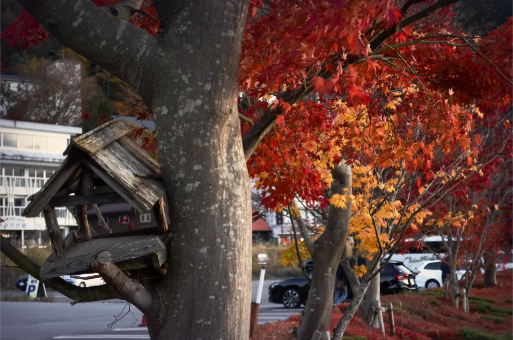 遊覽船棧橋的停車場邊邊就有一排楓樹,有棵樹上還有可愛的小鳥木屋!