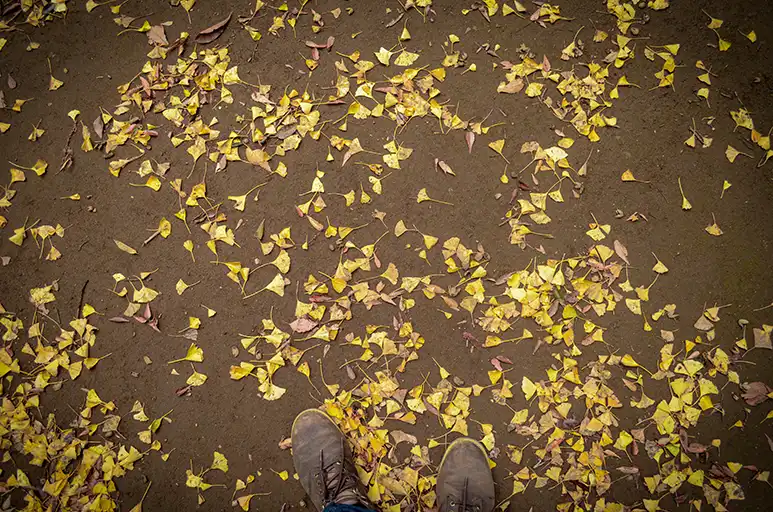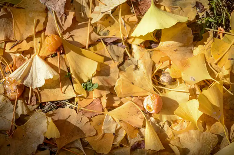 這個時節不僅地上鋪滿落葉,還會有銀杏果。銀杏果在日本會被用來加在茶碗蒸裡面,台灣比較常叫它白果,味道有點苦苦的。而它像這樣掉在地上爛掉的時候會發出一種潮濕的腐臭味,有些人非常受不了那個味道。