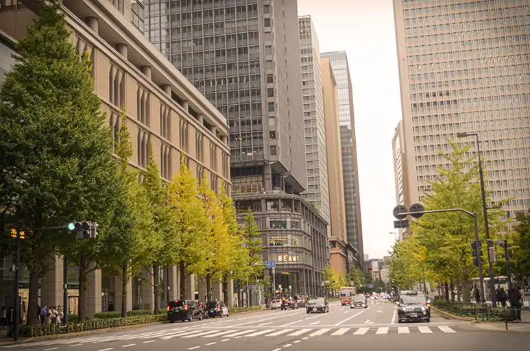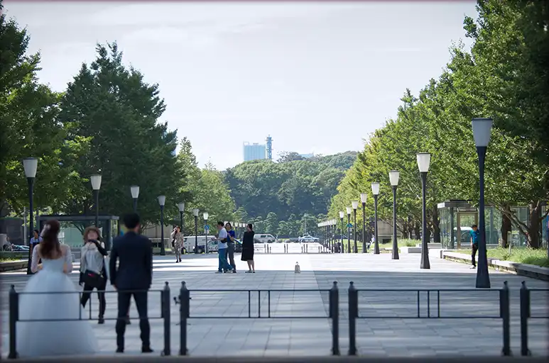 東京站前的丸之內町區域是東京的商業精華地帶,時髦的商業大樓與精品店林立,帶有一種歐美城市CBD的西洋氣質,以銀杏作為行道樹也是其特色之一。而東京車站的站前廣場對面就是通往皇居的大道,兩旁也是銀杏樹夾道歡迎你,整個視野很寬闊,又有各種很有日本代表性的建物,所以經常會看到有人在這裡拍婚紗。