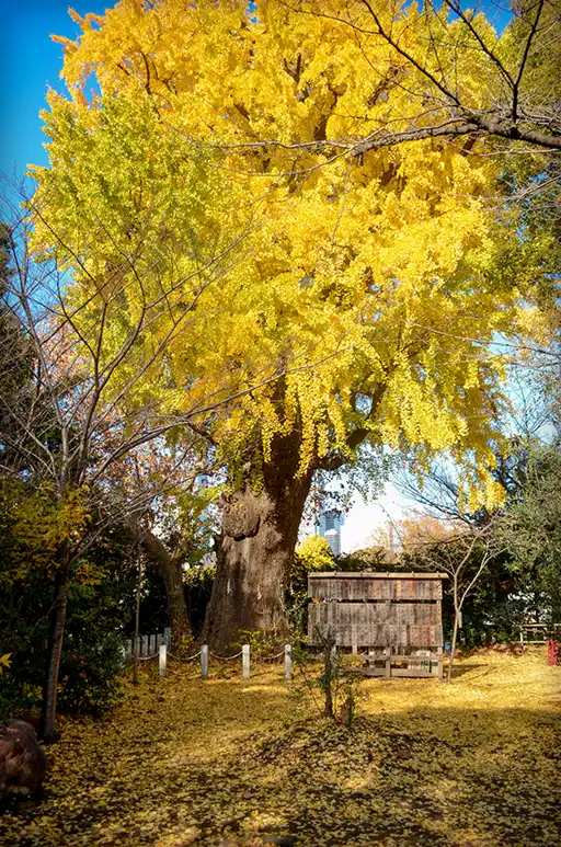赤坂冰川神社被稱為江戶七冰川之首,伴隨其悠久歷史的還有這棵推定有400年的樹齡的大銀杏,我到訪的時候銀杏還沒到真正最黃的時期,落葉的量就已經非常厲害了。
