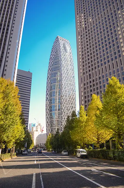 ▶ 圖中的高樓為東京時尚學院的Mode Gakuen Cocoon Tower繭型大樓。