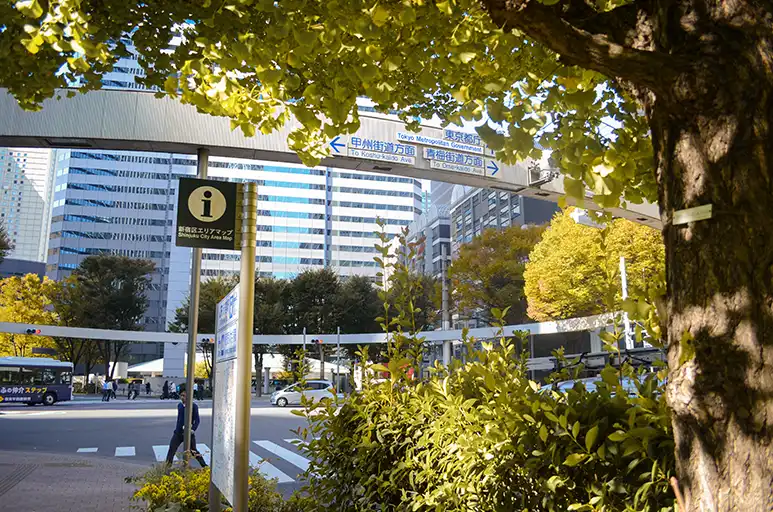 同樣是商業精華區,西新宿的街景則有別於丸之內,是更多玻璃帷幕、更乾淨明亮、更有現代日本風格的區域,並且同樣是以銀杏作為行道樹。