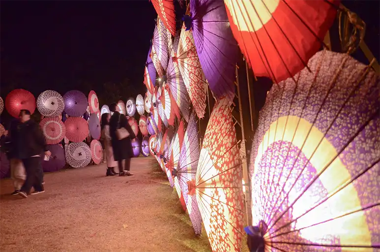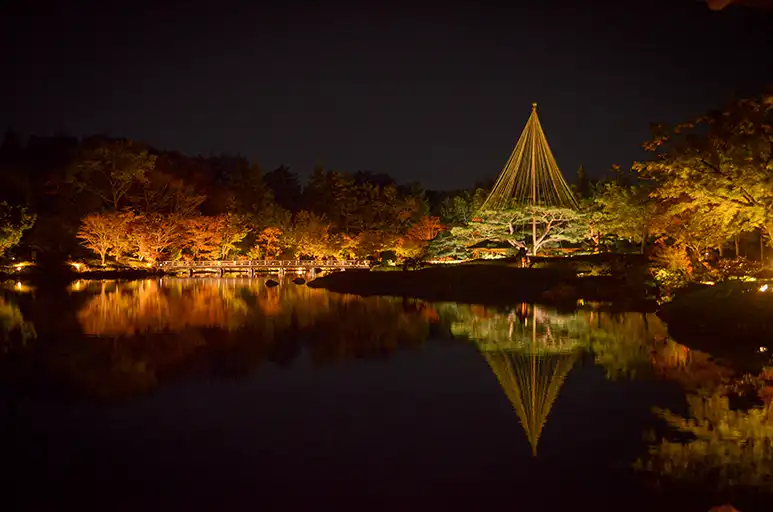 日式庭園裡面的植栽主要以楓樹與松樹為主,配合燈光倒映在水面相當有情調。入口附近還有提供紙傘可以讓你借來拍照喔。