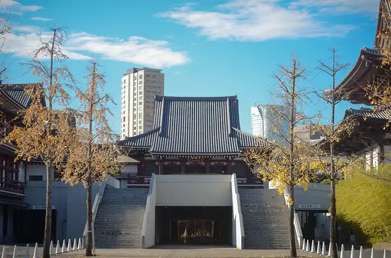 由於增上寺接受了德川家康的皈依,被指定為德川家的靈廟,後代的將軍也陸續捐獻蓋了許多建物,與德川家有著深厚的淵源,所以到處可以見到德川的三葉葵家紋。但是寺院一代受到過空襲,所以現在所看到的建築物大部分都是二戰後重建或新建的。
