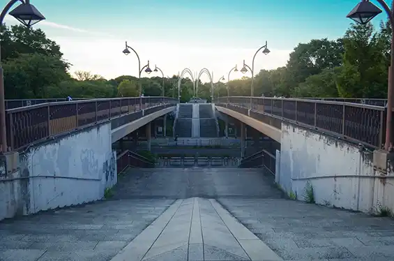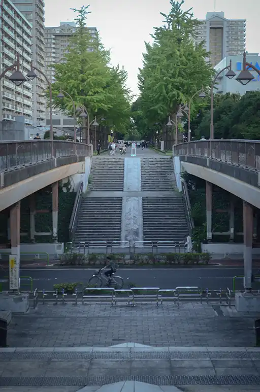往光之丘站方向,公園本體出來以後會先過一座跨馬路的橋到有商店街的區域,你會開始發現這一個區塊有很大部分人跟車是分層的,汽車走的馬路都在底下,人跟腳踏車都走在第二層的橋上,很有一種未來都市奇幻感。