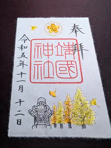 隔天重新再跑回來一次,整齊的銀杏樹很漂亮吧,雖然這個時候還沒有全黃,但不惜跑兩趟的理由其實是為了限定御朱印,靖國神社的銀杏也是東京知名的銀杏景點之一,所以神社也相應的會在這個時節推出跟銀杏有關的東西。而這裡的限定御朱印是很特別的刺繡朱印!
