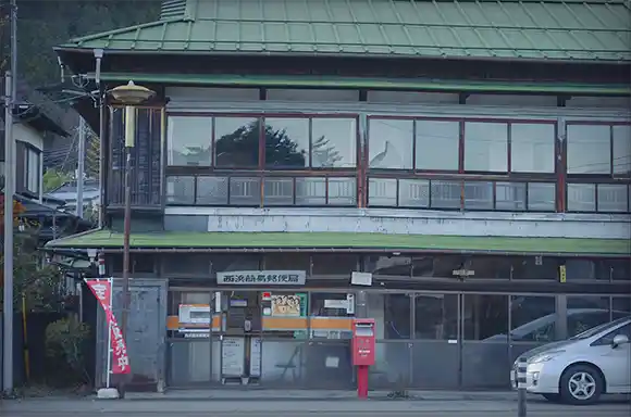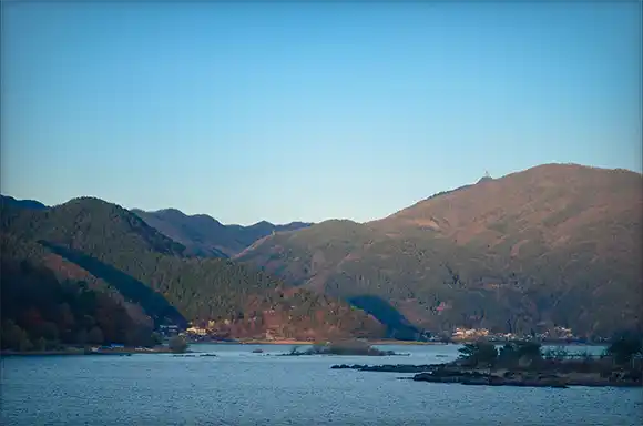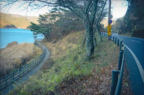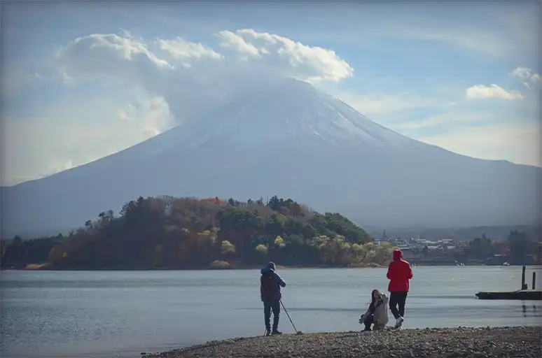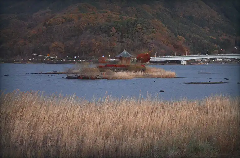 過了一區很多小碼頭的地方後,會看到一個叫「河口湖精進場」的岩石峽角,石頭有點崎嶇但可以走上去看看,你會注意到湖上有一個都是樹的島,裡頭有一個小小的「鸕鷀嶋神社」,一些帶你搭船遊覽的行程可以讓你進去參訪。