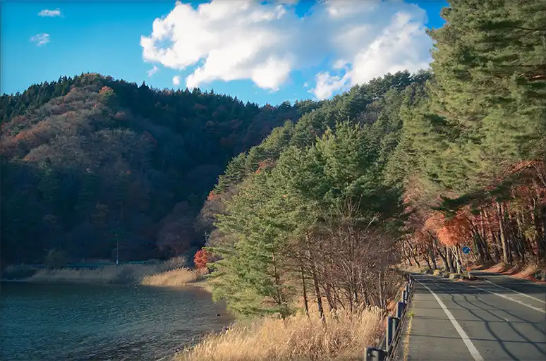 繞行過了這裡返回河口湖町的路上,有一些水上活動的出租店以及一些麵包店、咖啡廳,道路兩旁的林蔭非常漂亮。
