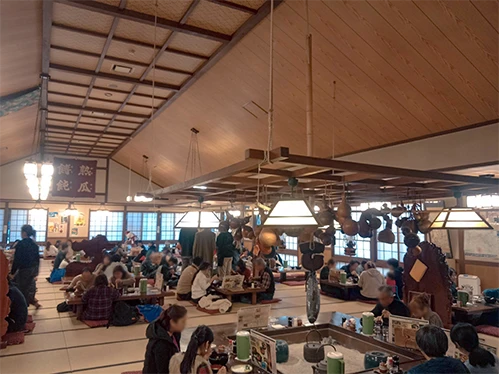 另外一家在河口湖大橋下來一路直走,在町役場[*4]對面的”小作”,也是口味上算是評價不錯的餺飥店,主打南瓜口味,店內是這種復古風圍爐裏[*5]式的用餐空間不過中間的爐子只是裝飾,沒有真的生火。店內還有土產店,等排隊的時候能逛一逛,有賣生的餺飥讓你回去煮。